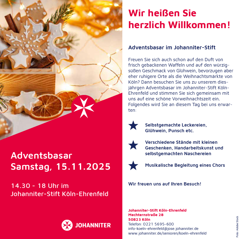 Freuen Sie sich auch schon auf den Duft von frisch gebackenen Waffeln und auf den würzigsüssen Geschmack von Glühwein, bevorzugen aber eher ruhigere Orte als die Weihnachtsmärkte von Köln? Dann besuchen Sie uns zu unserem diesjährigen Adventsbasar im Johanniter-Stift Köln-Ehrenfeld und stimmen Sie sich gemeinsam mit uns auf eine schöne Vorweihnachtszeit ein.